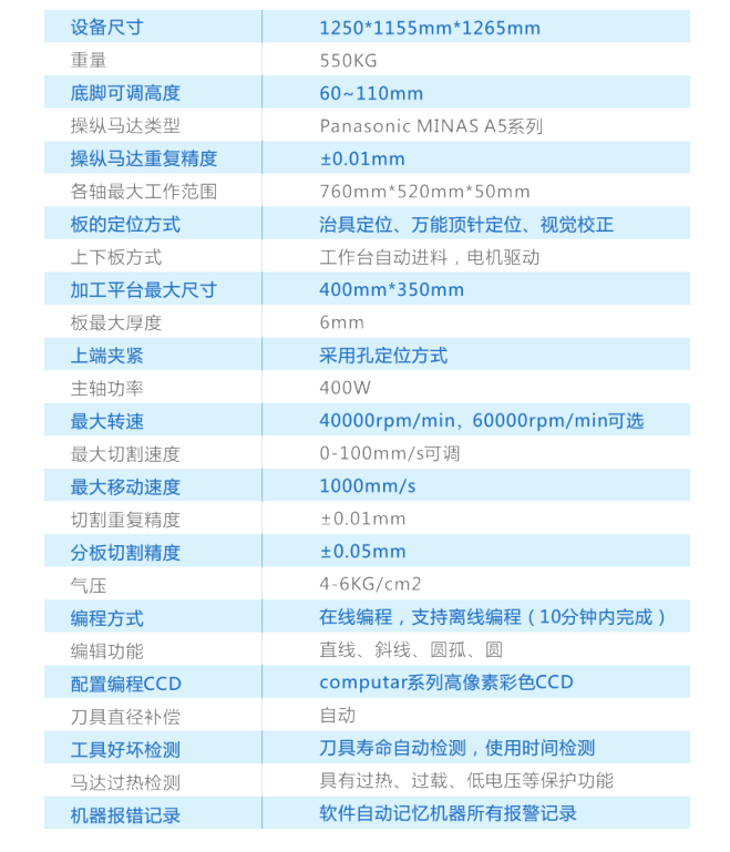 Win7作业系统,简明而人性化的界面两平台交互工作的PCB的上下料装置配置高像素CCD放大镜头,精度更高更自动MARK点定位校正系统,自动对立校正功能,切割精度更高